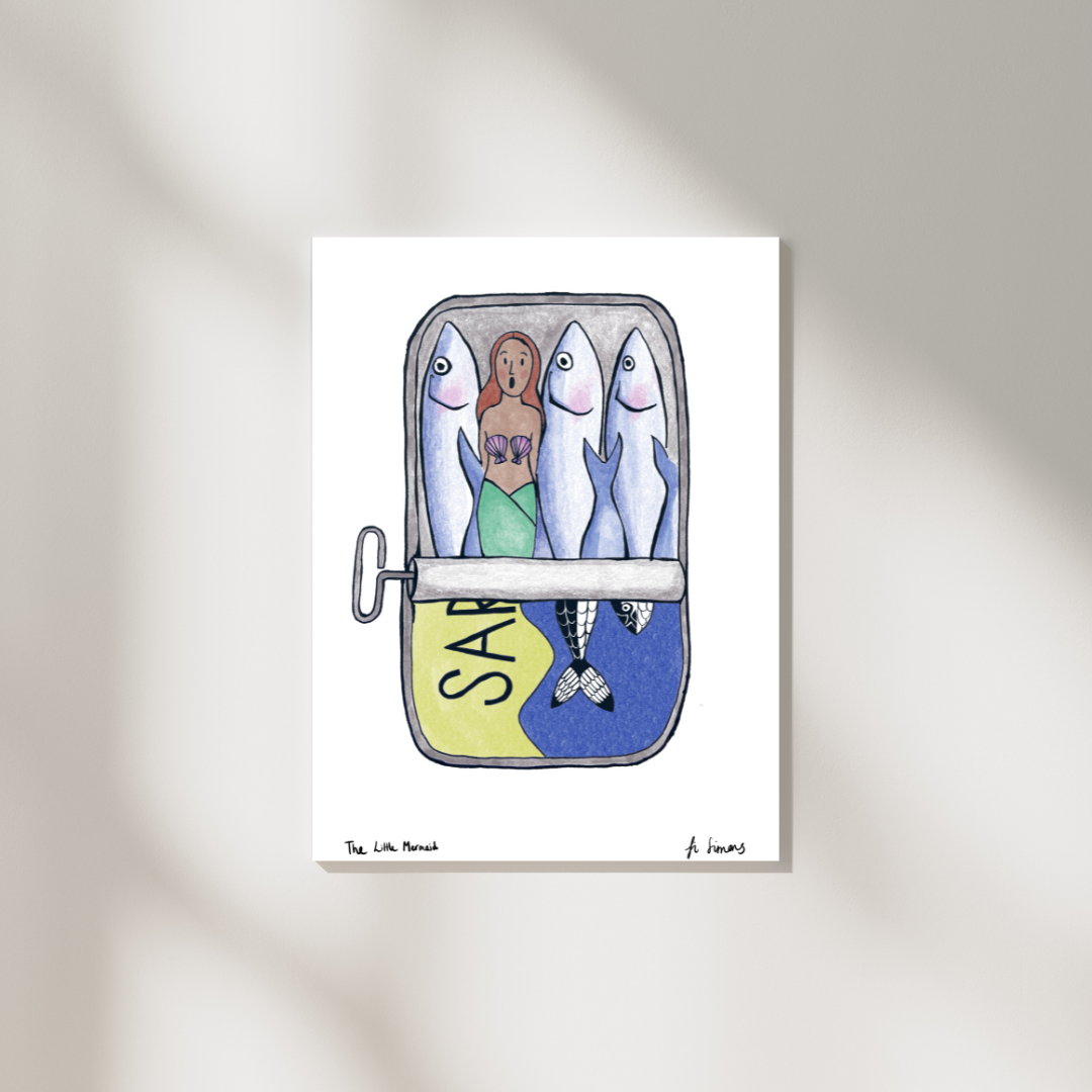 The little mermaid peaks out of a sardine tin in shock. This cheeky original illustration adds humour and a joyful splash of colour to any space.