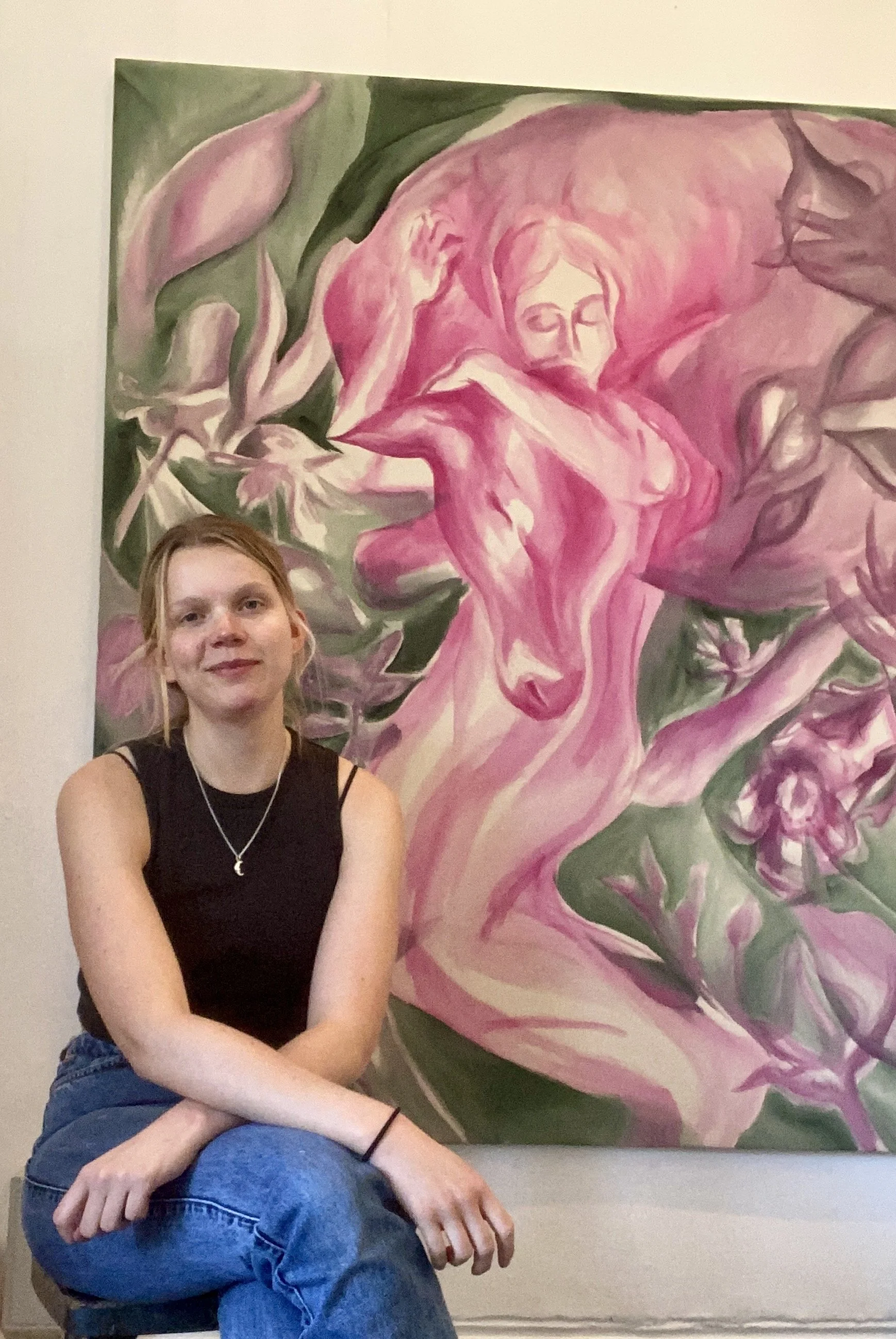 Fiona Simons (b.1998, London) creates ethereal figurative paintings that explore femininity, personal history, and the deep ties between humanity and nature. Working in luminous, layered washes of colour, she invites the viewer into intimate, scenes that feel both timeless and otherworldly.